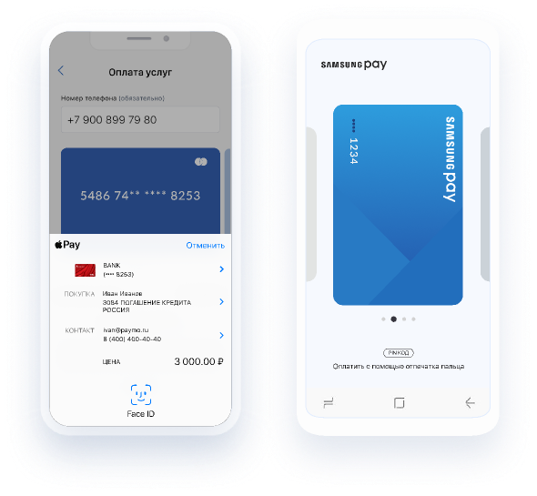 При подключении оплаты с помощью Apple Pay, Samsung Pay и Google Pay оплата будет осуществлена с привязанной к устройству карты.
